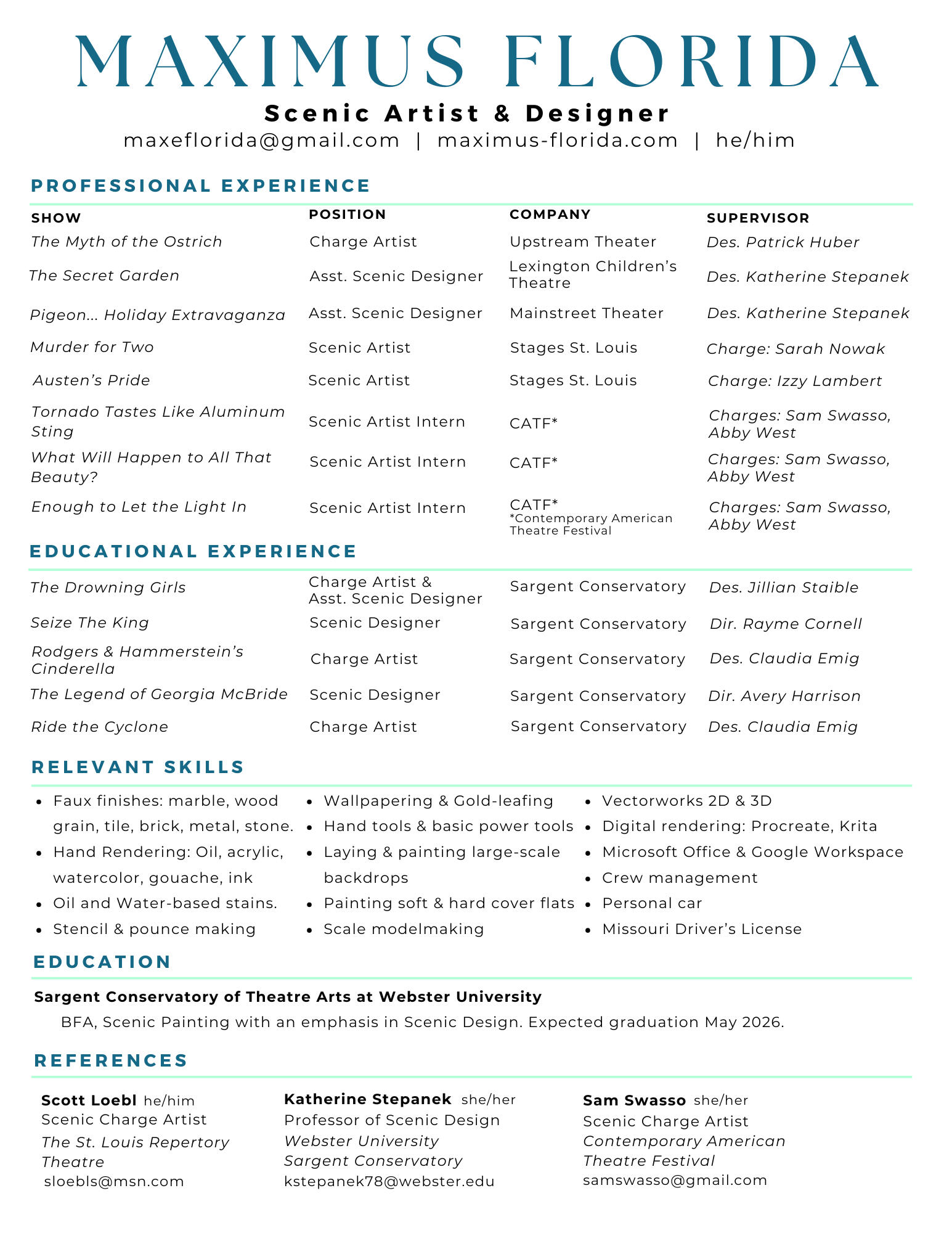 Max Florida is a scenic artist and designer from St. Louis, Missouri, who has worked in both professional and academic settings at the Sargent Conservatory of theater arts at Webster University. Max’s scenic design credits include Seize the King and The Legend of Georgia McBride (Sargent Conservatory), his assistant design credits include The Secret Garden (Lexington Children’s Theater), the world premier of The Pigeon Gets A Big Time Holiday Extravaganza! (Mainstreet theatre), and The Drowning Girls (Sargent Conservatory). In addition to design, Max has worked as a scenic charge artist for Rodgers and Hammerstein’s Cinderella, Ride the Cyclone, and The Drowning Girls (Sargent Conservatory), as well as a scenic painter for Murder for Two and Austen’s Pride (Stages St. Louis) and he has worked as a painting intern for the Contemporary American Theatre Festival’s 2024 season. Max always enjoys exploring new avenues in visual art, as well as spending time in good company with his cat and his friends.